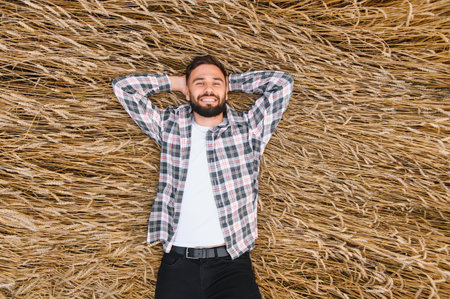 Young farmer resting in a golden wheat field, savoring the joy of a successful harvest, hands behind head, smiling with satisfaction