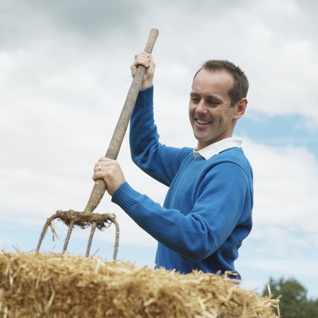 Man holding a pitchfork beside haystacks in a farm