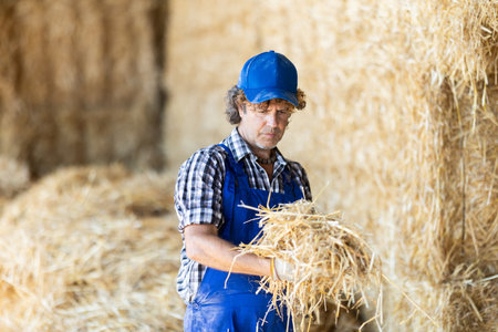 Male farmer checking straw in warehouse