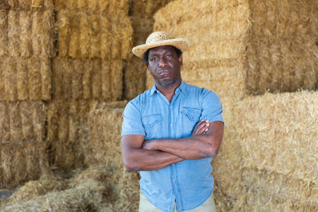 Confident african american farmer standing near straw stack