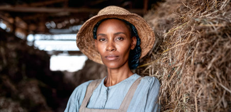 A woman stands next to piles of hay in a barn. She wears a straw hat and a simple outfit. The space is well lit with natural light coming through the barn structure.