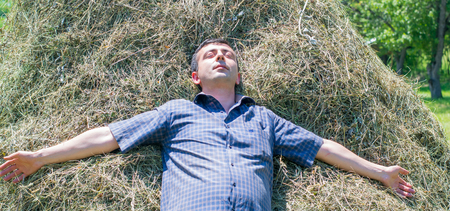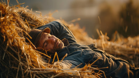 Tired farmer lying on a haystack, AI generated Image