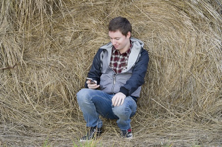 Man with phone sits near haystack