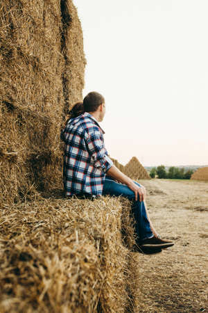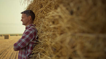 Man rest hay stack at agricultural field. Farmer lean dry wheat pile on autumn harvesting season. Focused agribusiness owner worker observe rural stubble farmland. Professional agrarian at countryside