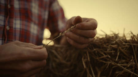 Farmer hands hold wheat spikelet at golden sunset agriculture field. Unknown agronomist check examine grain quality at haystack farmland after autumn cropping season closeup. Agribusiness concept