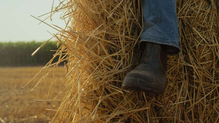Closeup boot hay stack at wheat stubble field. Farmer resting at straw bale after working day. Unrecognized man farmland worker relax at countryside on autumn sunny evening. Agro industry harvesting