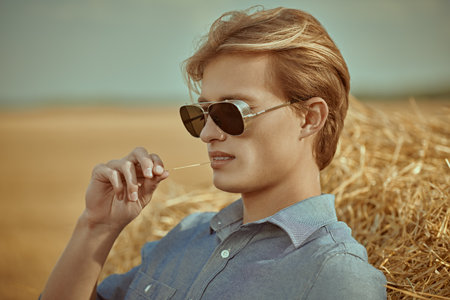 Fashion shot. Portrait of a handsome male model with blond hair wearing fashionable sunglasses and denim shirt relaxing by a haystack against an autumn landscape. Glasses fashion.