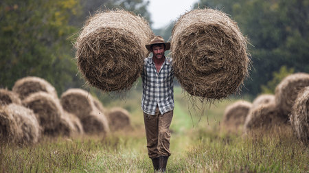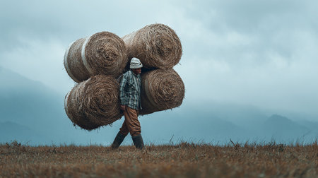 Farmer carrying hay bales on his back in the countryside.