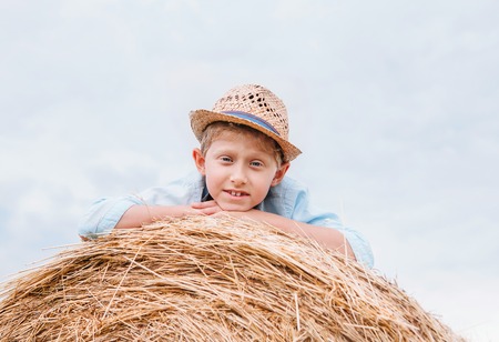 Boy in straw hat lying on the haystack