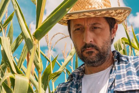 Farmer examining corn maize plants in field. Handsome adult agronomist is inspecting development of crops on cultivated plantation.