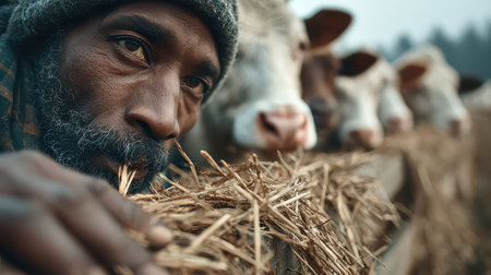 A thoughtful farmer stands among cows in a tranquil rural setting, straw in his mouth, symbolizing the connection between humans and farming life.