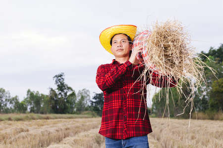 Asian farmer with rice stubble in the field