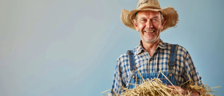 With hay fork in hand, a smiling senior farmer wears straw hat, plaid shirt, overalls, and holds hay fork in vertical layout on white background.