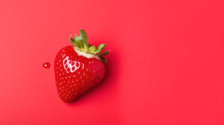 Strawberry with leaf on red background, top view, copy space. ai generated