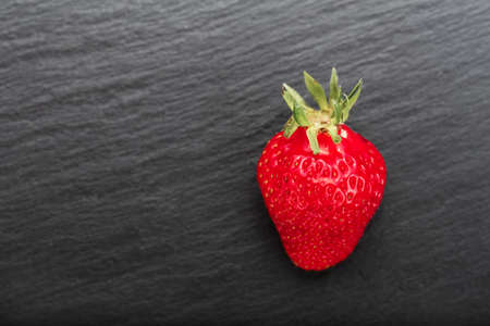 One strawberry on a black stone background, dark food photography