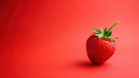 A single, ripe strawberry sits on a solid red background, with its green stem and leaves extending upwards. The strawberry is in focus, while the background is blurred, creating a sense of depth and highlighting the fruit's vibrant color.