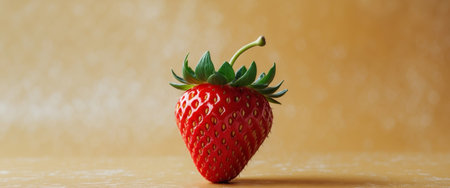 AI Generated. Bright Red Strawberry with Lush Green Calyx on Golden Background