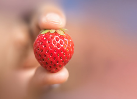 Teenager Girl is holding a ripe tasty bright strawberry. Summer Vitamin Food. Ripe organic strawberries