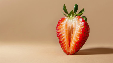 Half of a fresh strawberry on beige background, studio shot.