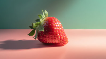 A bright red strawberry sits alone on a soft pink background, highlighting its vibrant color and fresh appearance. The minimalist design emphasizes the natural beauty of the fruit.