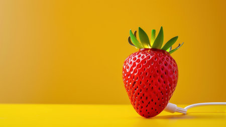 This striking image features a bright red strawberry connected to a white charging cable, symbolizing the fusion of nature and technology. With a vibrant yellow background enhancing its appeal, this unique concept captures attention and sparks creativity.