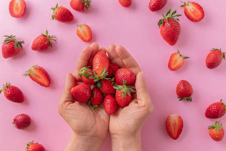 Top view of womans hands holding ripe juicy strawberries on a pastel pink background