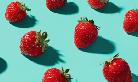 Fresh Strawberry Pattern oA vibrant collection of hyperrealistic top-down views featuring fresh, ripe strawberries scattered across various clean, solid, harmoniously colored backgrounds. n Colorful Backgrounds. High quality photo