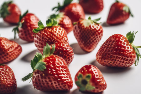 Fresh strawberries scattered on a white background. Close-up shot highlighting their vivid red color and seeds. Concept of healthy fruit