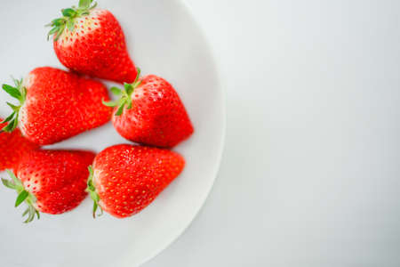Healthy strawberry isolated on white background. Copy space. Top view