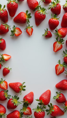 A delightful arrangement of fresh, juicy strawberries creates a stunning border around a blank space, inviting creativity. The vivid red hues and lush green leaves evoke a sense of freshness and summer sweetness, perfect for food lovers and culinary enthusiasts.