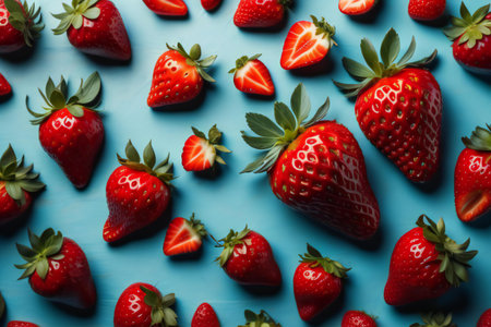 Sweet, plump strawberries presented on a refreshing blue background, hinting at the cool, juicy satisfaction they offer