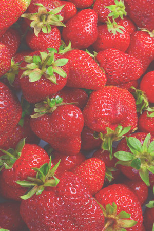 A group of fresh strawberries background. Close up, top view. Fruit and healthy food concept.