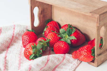 Close up shot, fresh strawberries with a bright red color, in a rustic wooden box next to a cloth, ready to eat. Selective Focus
