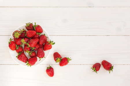 Strawberry on a white wooden background top view. Red strawberries on a white plate and scattered on the table. A beautiful still life I love. summer still life. The concept of healthy eating