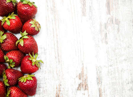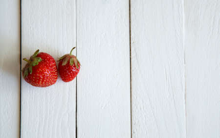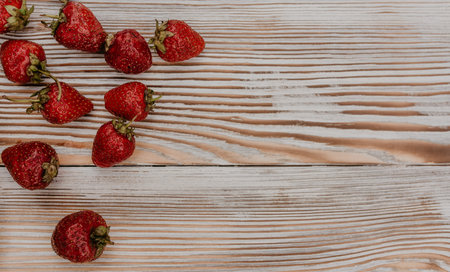 strawberry fruits on the right side on wooden background with copy space. View from above.