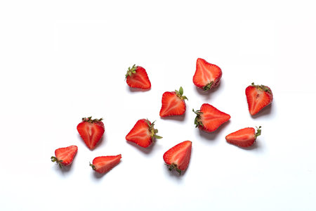 This minimalist image showcases freshly cut strawberries scattered artfully on a clean white surface, emphasizing their stunning color and form, evoking feelings of simplicity and freshness.