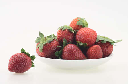 Close Up on fresh ripe red strawberries in a ceramic white bowl on a white background, isolated