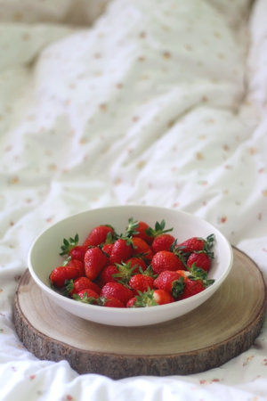 Bowl of fresh strawberries and wooden tray on a bed. Selective focus.