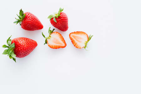 Whole and half ripe strawberry isolated on white background. Sweet fresh summer fruit, healthy food. A modern hard light, dark shadow, top view