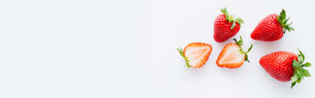 panoramic shot of fresh and ripe strawberries on white background with copy space