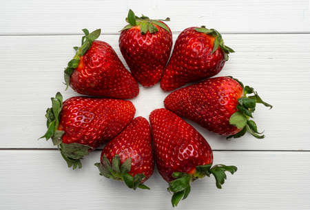 Top above overhead view photo od whole and cut strawberries making circle isolated on white background