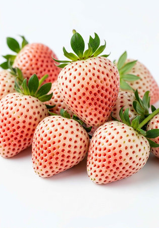 Detail of strawberries isolated over white with copy space, delicate soft faded tone useful as background