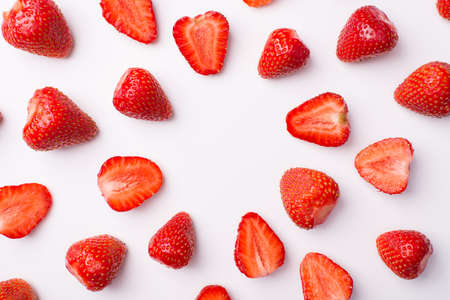 Top above overhead view photo od whole and cut strawberries making circle isolated on white background