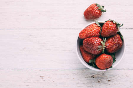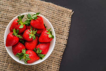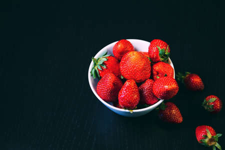 White bowl with fresh red strawberries on a dark wooden table close up. Spring or summer backgruond. Healthy food ingredients theme concept. Image is with copy space.