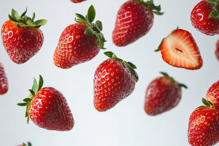 Ripe red strawberries with vibrant green leaves levitating against a light blue background, creating an eye catching and refreshing visual perfect for summer themes and healthy eating