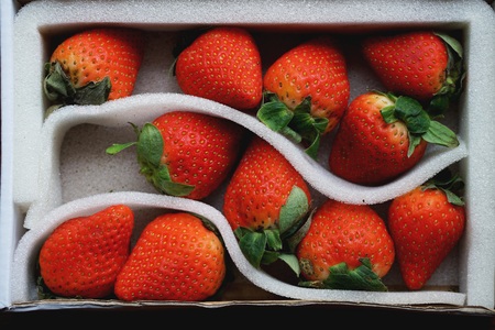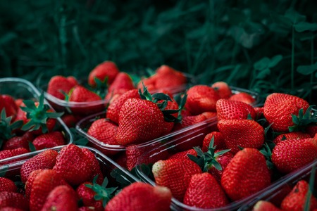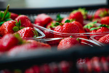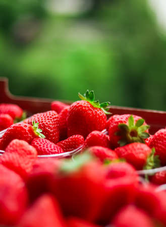 Strawberries packaged in box, sweet ripe perfect strawberry harvest, organic garden and agriculture concept