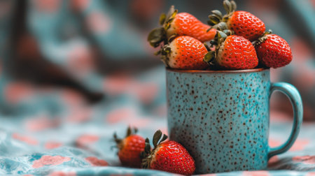 A charming arrangement featuring ripe strawberries nestled in a blue mug atop soft fabric. This image evokes freshness and is perfect for summer recipes or as a healthy snack idea.