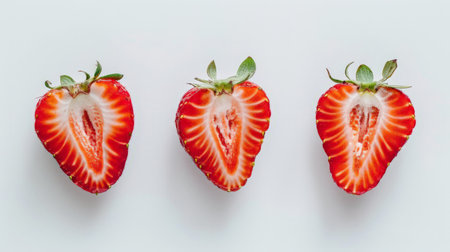 A beautiful arrangement of fresh red strawberries on a white background, showcasing their vibrant color and natural texture, ideal for healthy eating and culinary uses.