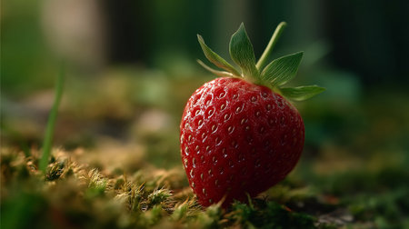 A ripe red strawberry with green leaves sitting on moss in a forest