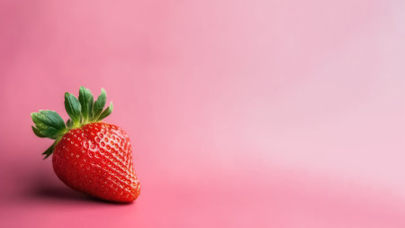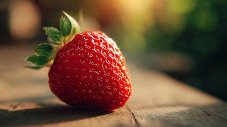 Perfectly ripe red strawberry with a vibrant green stem and intricate details of its tiny golden seeds. fresh, healthy, and delicious fruit, ideal for food, diet, and summer concepts.